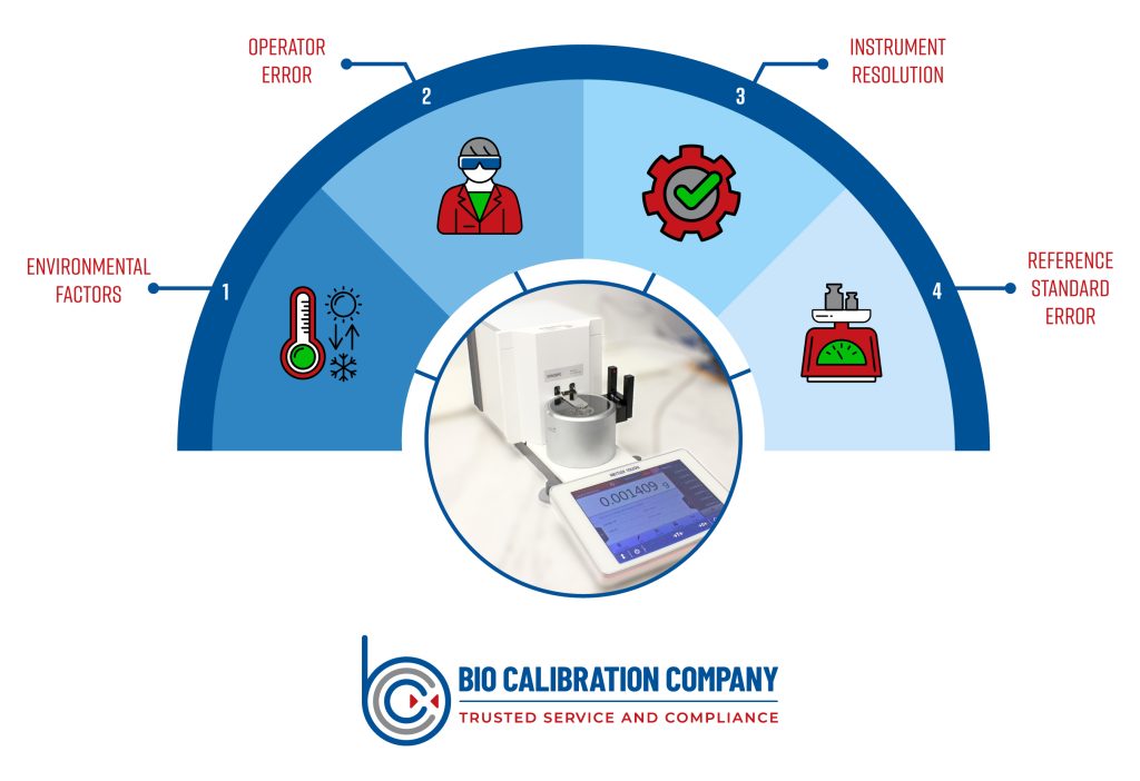 At Bio Calibration Company, the sources of error that are considered when calibrating scales and/or balances are: